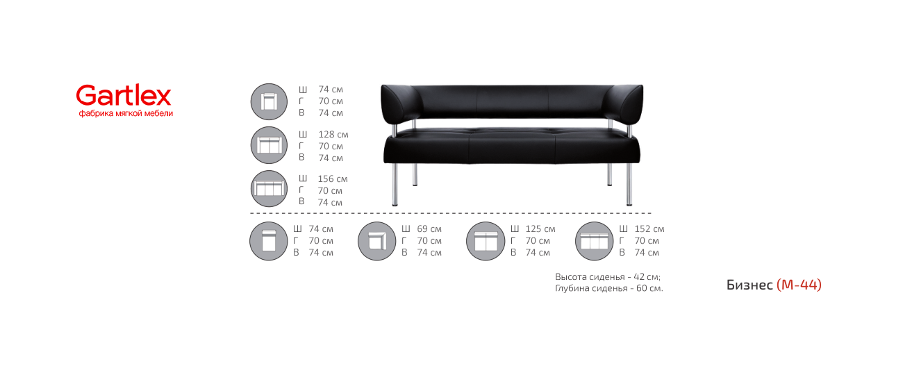 Высота сиденья - 42 см; Глубина сиденья - 60 см.