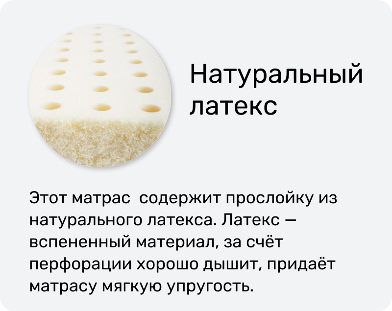 Последний материал отвечает за ортопедические и гигиенические свойства матраса. Он эластичный, поэтому легко принимает форму тела и так же быстро возвращается к первоначальному состоянию. Пористая структура латекса обеспечивает постоянную циркуляцию воздуха и комфортный для кожи микроклимат. При этом сам материал не впитывает запахи и не может служить домом для бактерий и пылевых клещей, поэтому никогда не станет причиной аллергии и раздражения. Чехол матраса выполнен из трикотажа на объемной стежке, что придает дополнительную пышность и мягкость матрасу.